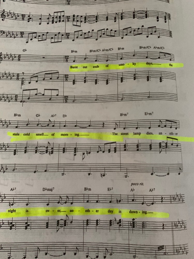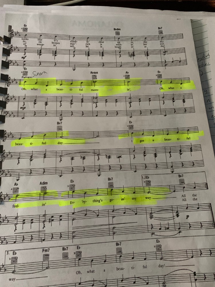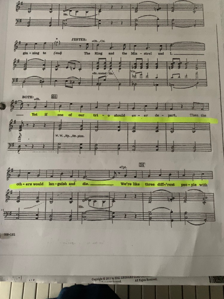 Cumulative Songs: Seasons of love, You can’t stop the beat, Over The Rainbow, Marian, Oh what a beautiful morning, Hamilton, Lay all my love, Castle on a cloud, On this island, If you believe, One hand one heart, Minstrel, Memory, For good.